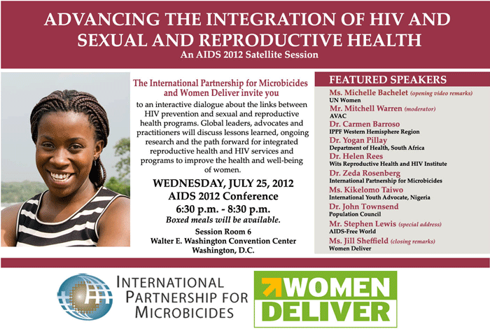 The International Partnership for Microbicides and Women Deliver invite you to an interactive dialogue at AIDS 2012 about the essential links between HIV prevention and sexual and reproductive health programs. Global leaders, advocates and practitioners will discuss lessons learned, ongoing research and the path forward for integrated reproductive health and HIV services and programs to improve the health and well-being of women. No RSVP necessary.