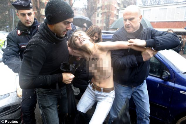 But the demonstrators, who had ‘Basta Berlusconi’, meaning ‘Enough of Berlusconi’, written on their bodies, were grabbed by police officers and dragged away before they could reach him.