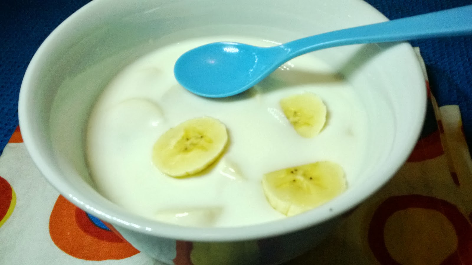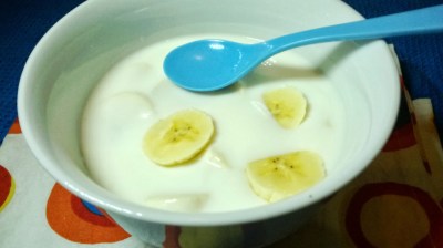 Peel a small banana and mash with a fork, add a little amount of liquid baby milk to thin down the thickness and add serve.