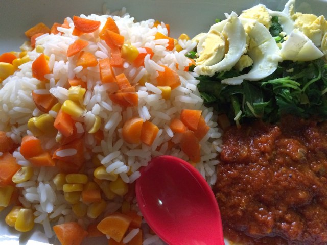 My Sunday rice was no exception. It was vegetarian with lots of carrots, corn, spinach, boiled eggs and tomato stew. It was delicious and the kids loved it. The first thing they were excited about were the corn and the eggs…….I should add that to all their meals. LOL
