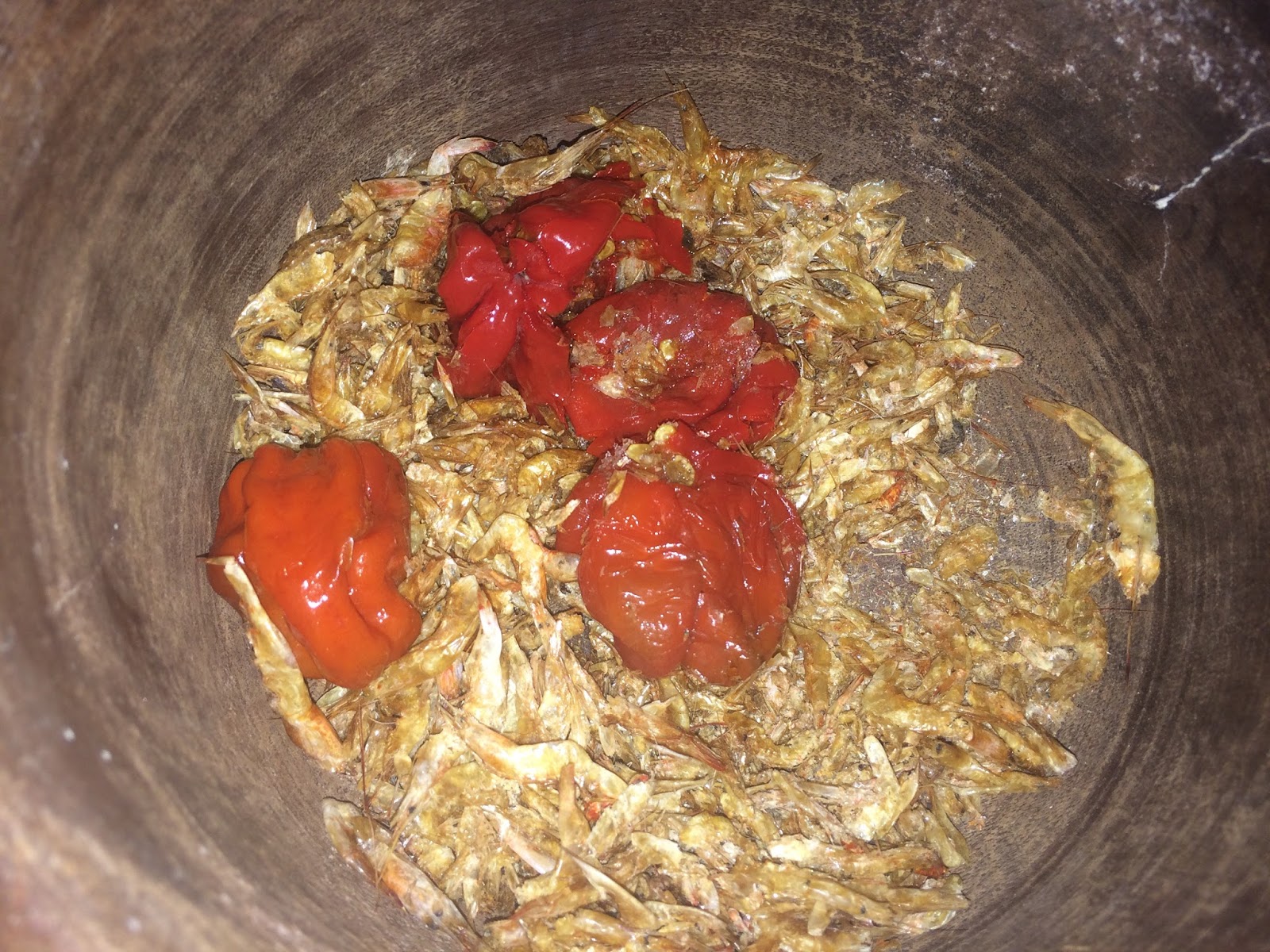 Dry crayfish and fresh pepper ready for pounding.
