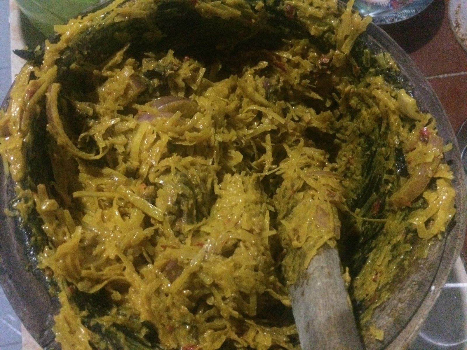 Abacha is a local food made from cassava, potash, Ugba (will find out what the english or botanical name is…after my meal, onions, pepper, crayfish and some palm oil. Garnished with stockfish, vegetables such as: scent leaves/ garden egg leaves, fried fish or kpomo.