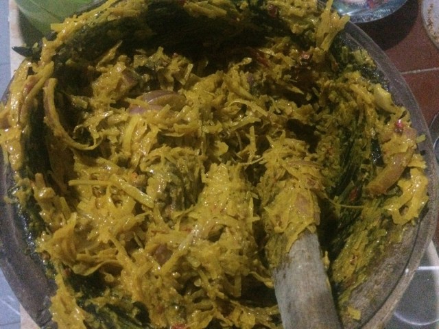 Then add the soft cassava flakes, followed by the ugba. Stir
